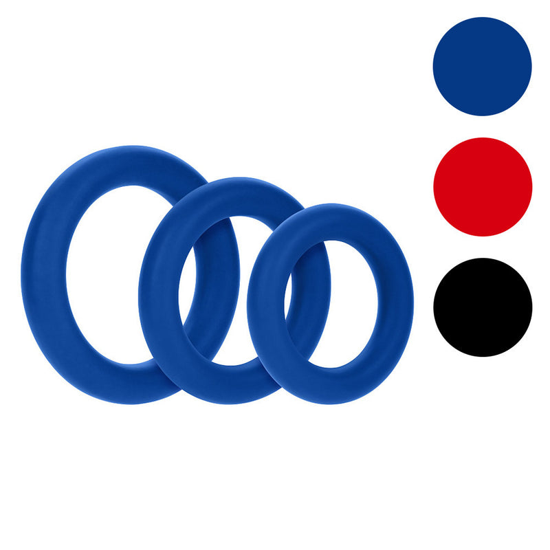 A three-pack of silicone cock rings to ensure the perfect fit. Stretches up to 2x size.